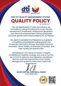 The DTI is responsible for realizing the country’s goal of globally competitive and innovative industry and services sector that contribute to inclusive growth and employment generation.